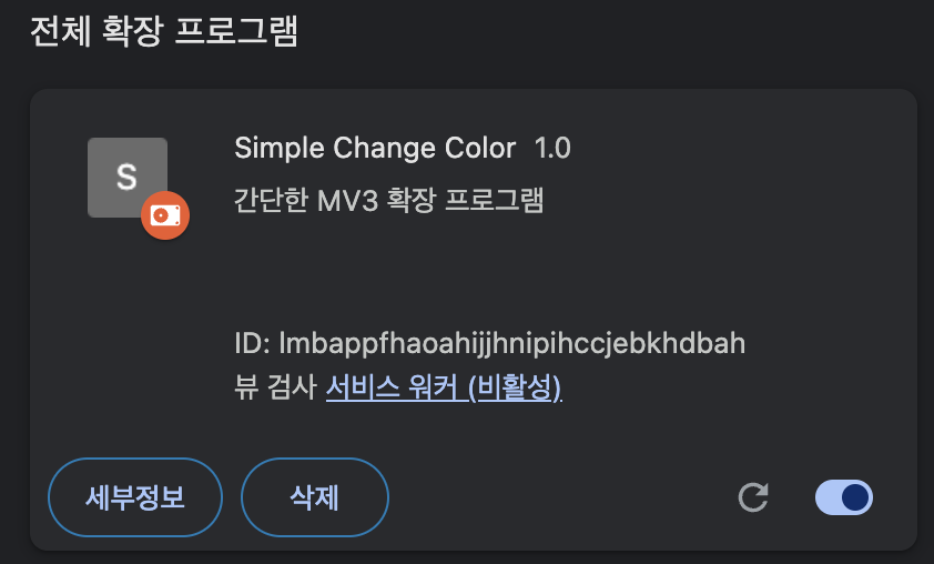 1// manifest.json2{3 "name": "Simple Change Color",4 "description": "현재 탭의 배경색을 변경하고 텍스트를 추가하는 간단한 MV3 확장 프로그램",5 "version": "1.0.0",6 "manifest_version": 3,7 "permissions": [8 "activeTab",9 "scripting"10 ],11 "host_permissions": [12 "<all_urls>"13 ],14 "action": {15 "default_popup": "popup.html"16 },17 "content_scripts": [18 {19 "matches": [20 "<all_urls>"21 ],22 "js": [23 "contentScript.js"24 ],25 "run_at": "document_idle"26 }27 ]28}29