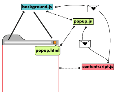 contentscript.js 사용자가 방문하는 영역에서 작동하는 스크립트 페이지의 현재 상태에 대한 정보를 전달한다. 현재 페이지의 DOM을 읽어와서 조작이 가능하다.
