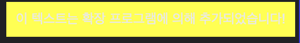 107// contentScript.js108chrome.runtime.onMessage.addListener((request, sender, sendResponse) => {109 if (request.action === "addText") {110 const newElement = document.createElement('div');111 newElement.textContent = '이 텍스트는 확장 프로그램에 의해 추가되었습니다!';112 newElement.style.position = 'fixed';113 newElement.style.top = '10px';114 newElement.style.right = '10px';115 newElement.style.backgroundColor = 'yellow';116 newElement.style.padding = '10px';117 newElement.style.zIndex = '9999';118 document.body.appendChild(newElement);119 sendResponse({status: "Text added successfully"});120 }121 return true; // 비동기 응답을 위해 필요합니다.122});파일은 위 주석에 나와있는 것처럼 나눠야 한다.