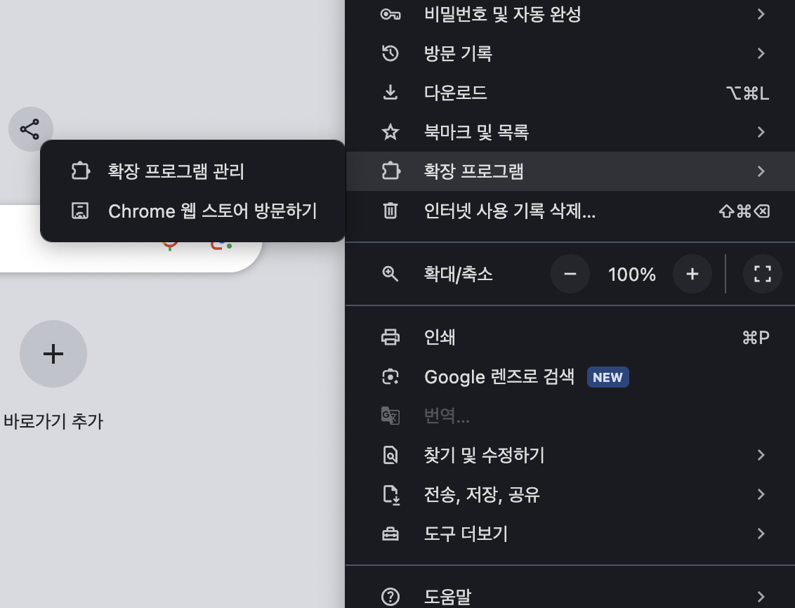 확장 프로그램 관리와 Chrome 웹 스토어 방문하기가 있는데 생각보다 크롬 확장프로그램을 사용을 안하는 사람이 많다.
