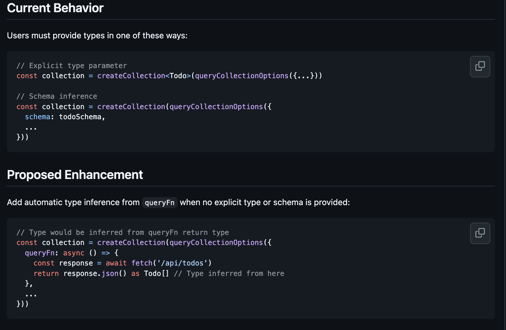1// 기존 방식 - 타입을 수동으로 지정2const collection = createCollection<Todo>(queryCollectionOptions({...}))해결 : 요구사항대로 queryFn의 반환 타입에서 자동으로 타입 추론하도록 구현