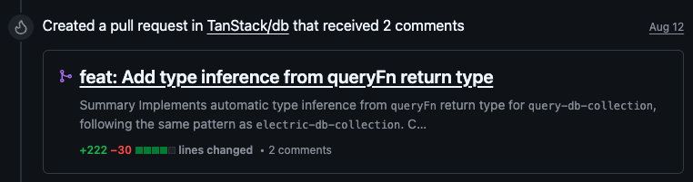 1// 새로운 방식 - 자동 타입 추론2const collection = createCollection(queryCollectionOptions({3 queryFn: async () => response.json() as Todo[] // 이 타입이 자동으로 추론됨!4}))이렇게 자동으로 타입 추론하게 만들기 위해서 내부 Interface의 타입 우선순위를 만들어야하는데요. 그전에 InferQueryFnOutput 타입 헬퍼 개발하고, electric의 ResoveType 시스템을 보면서 (타입 우선순위: Explicit → Schema → QueryFn → Fallback) 타입 추론 기능을 구현했습니다.