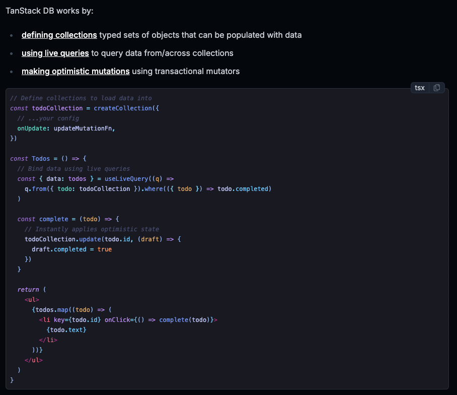 생각보다 많은 TANSTACK 의 라이브러리들을 보면서 하나 씩 읽던 중에 DB 라이브러리를 들어가서 이게 무슨 "라이브러리지? 우와 오픈소스는 이런 식으로 만드는 구나" 라고 혼잣말을 하게 되면서 점점 저는 빠져들어갔습니다.